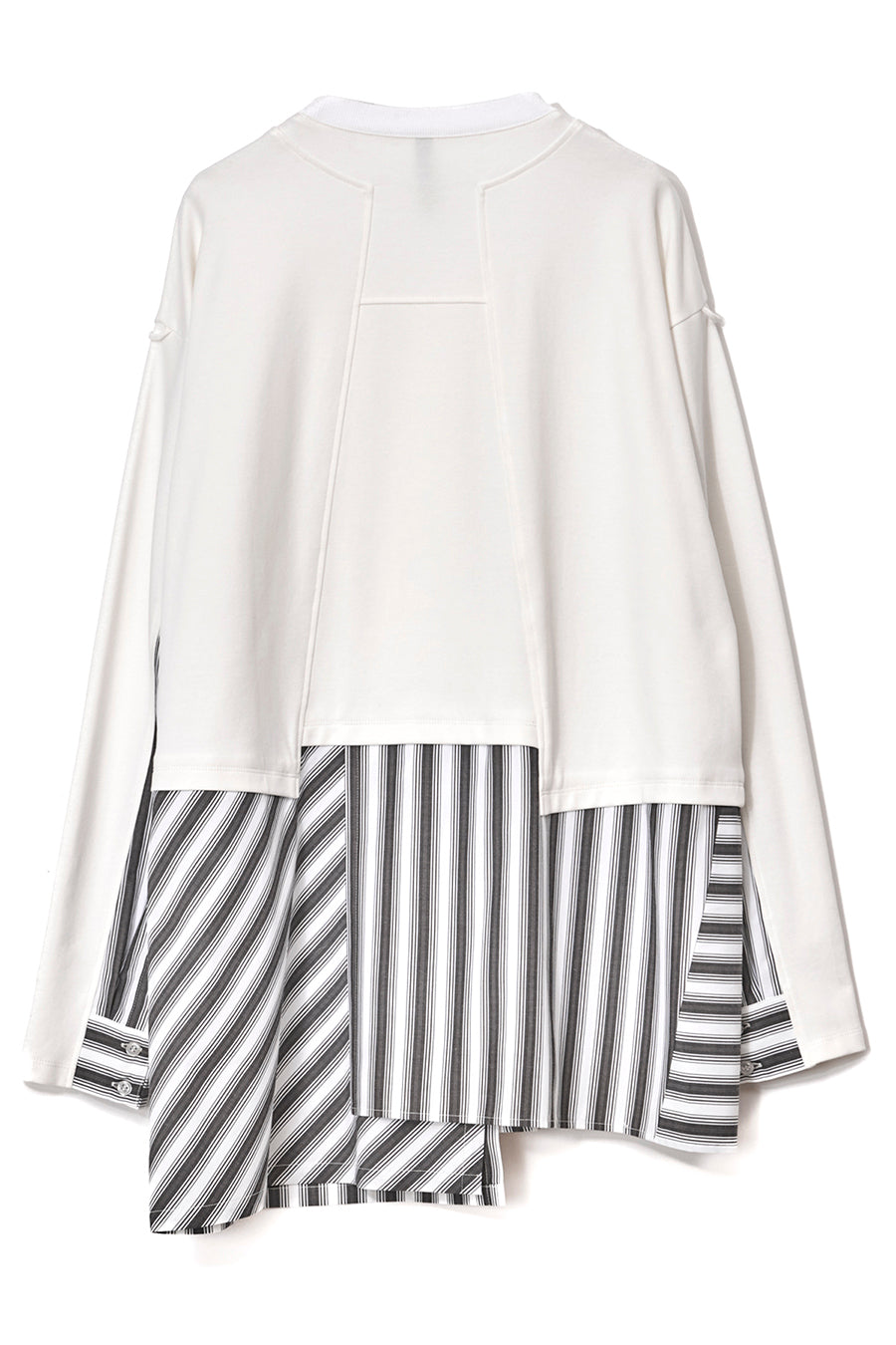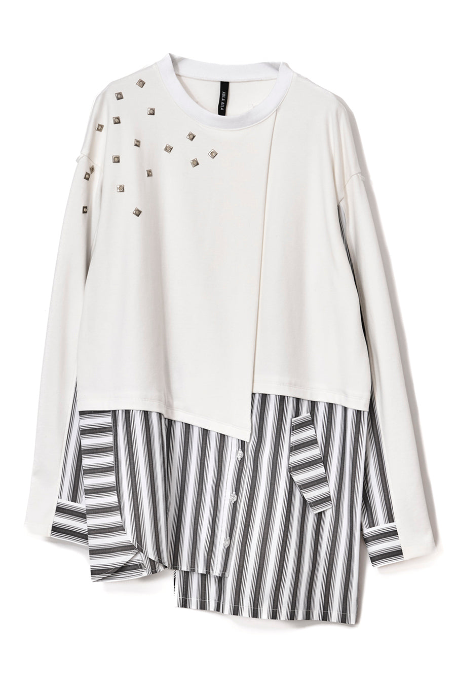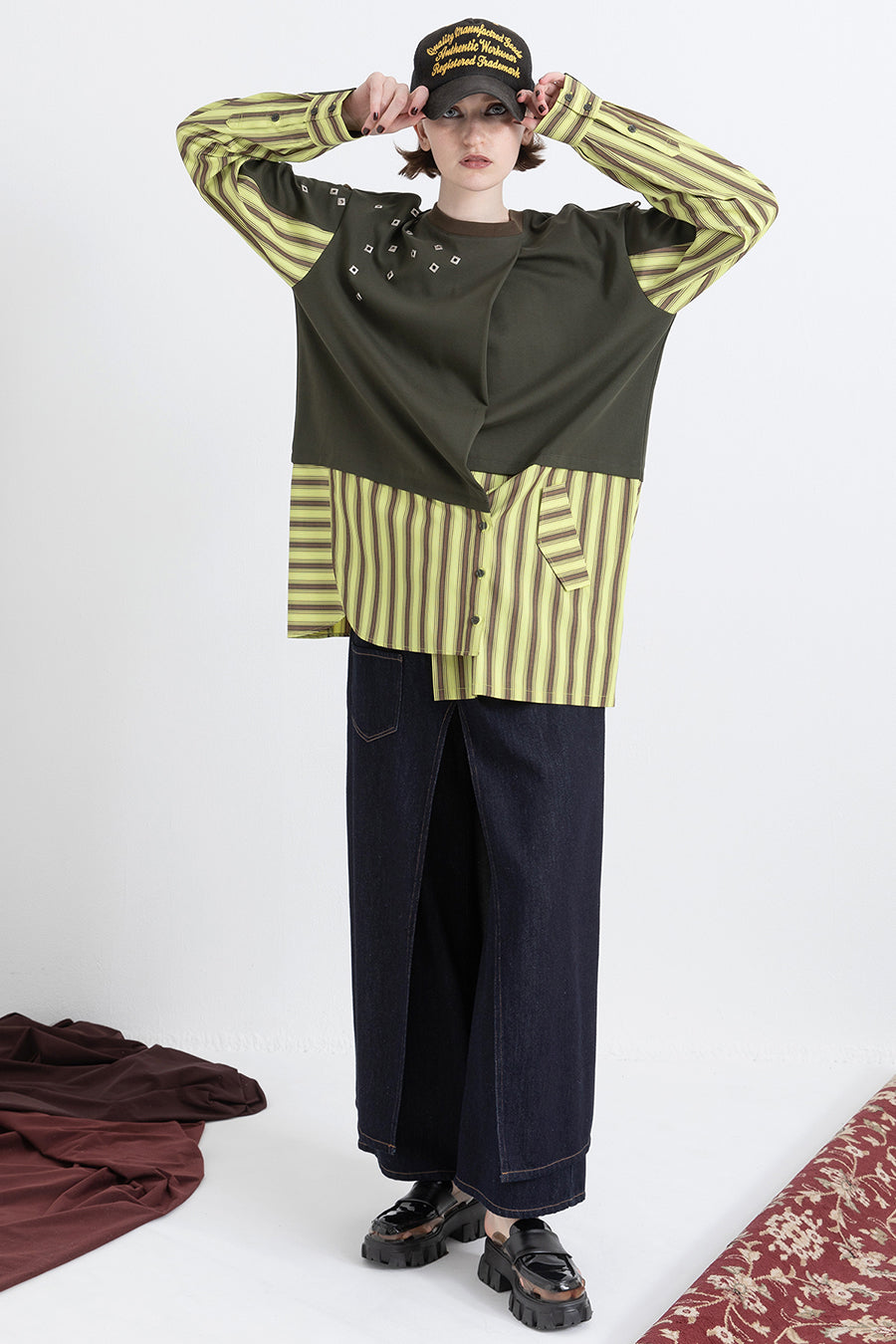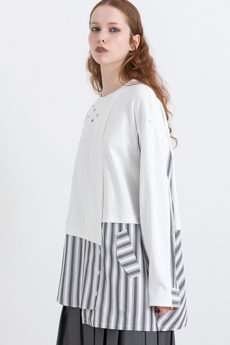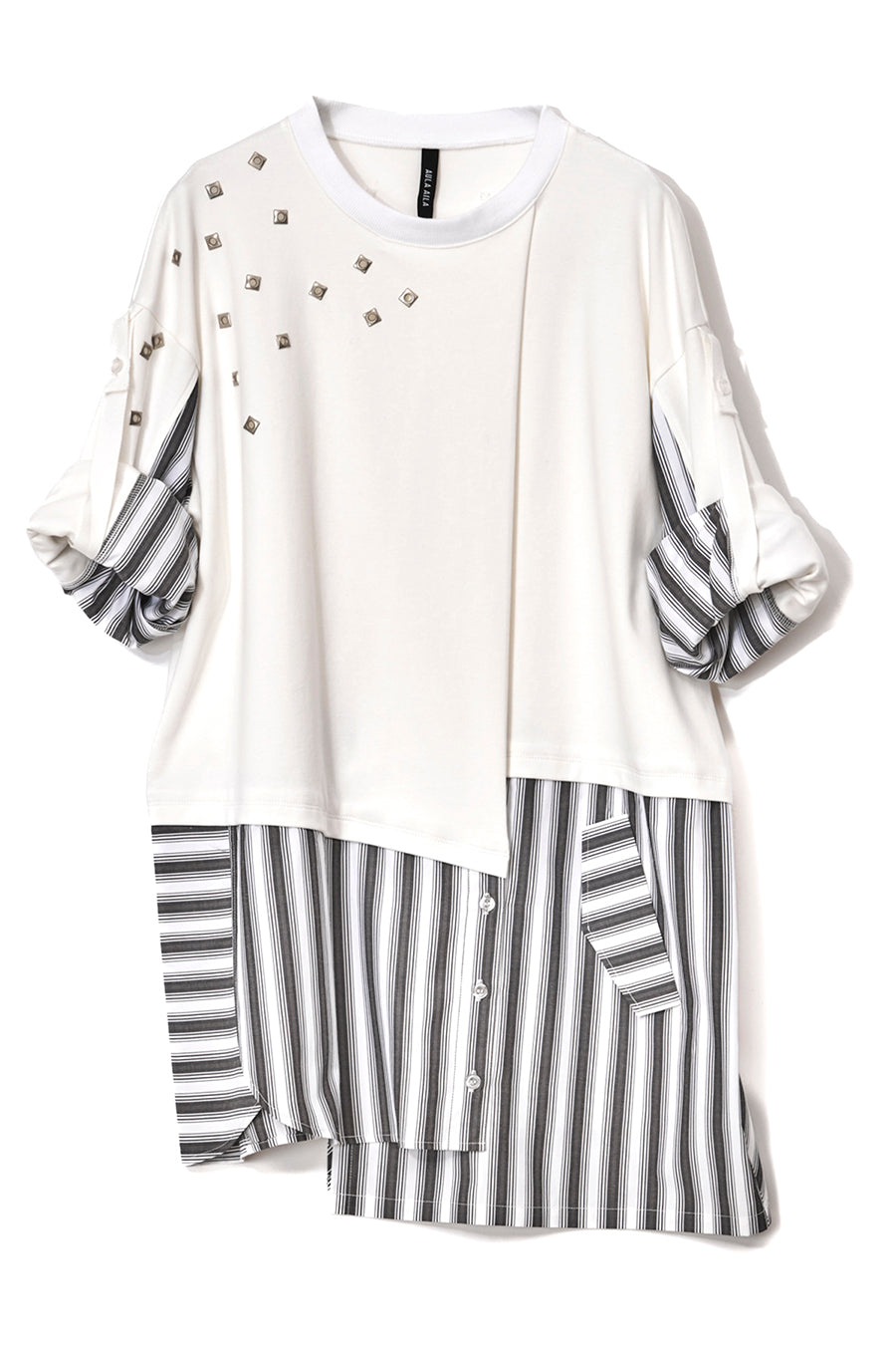 サラリとしたコットンスムースをべスースに、ストライプのシャツ生地を組み合わせたロングスリーブTシャツ。秋を感じられる温かみのあるストライプが目を引き、袖はロールアップタブが付いているので、多様な気温に対応できるのも嬉しいポイント。右肩周辺には、スクエア型のハトメをランダムにつけてアクセントに。ゆとりのあるサイジングでストレスフリーで着られ、抜け感のある印象にしあがるアイテム。裾のシャツボタンを開けると、よりAラインのシルエットも楽しめる。