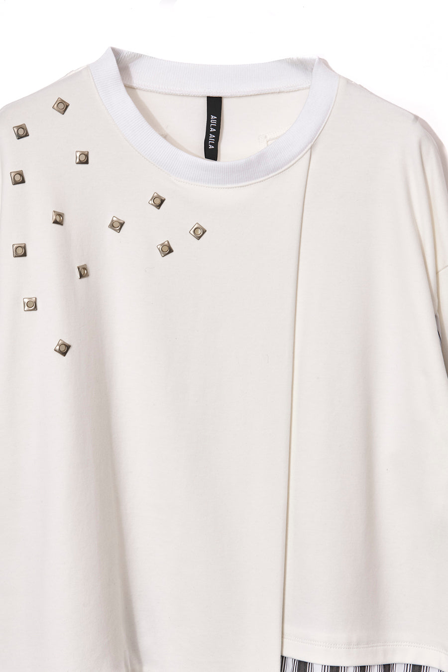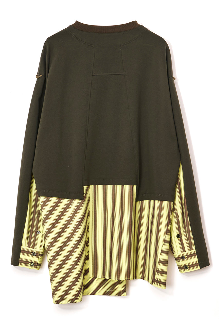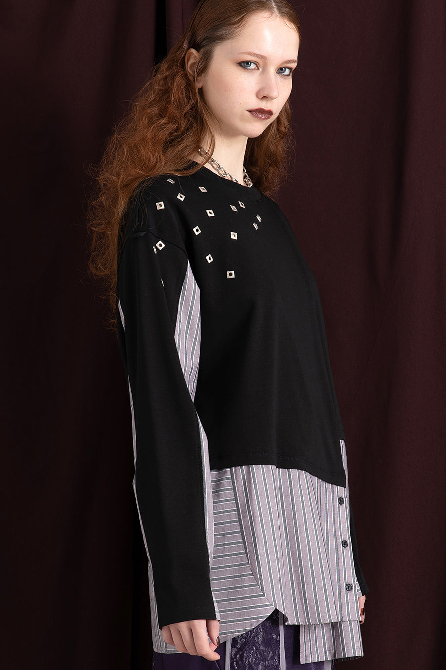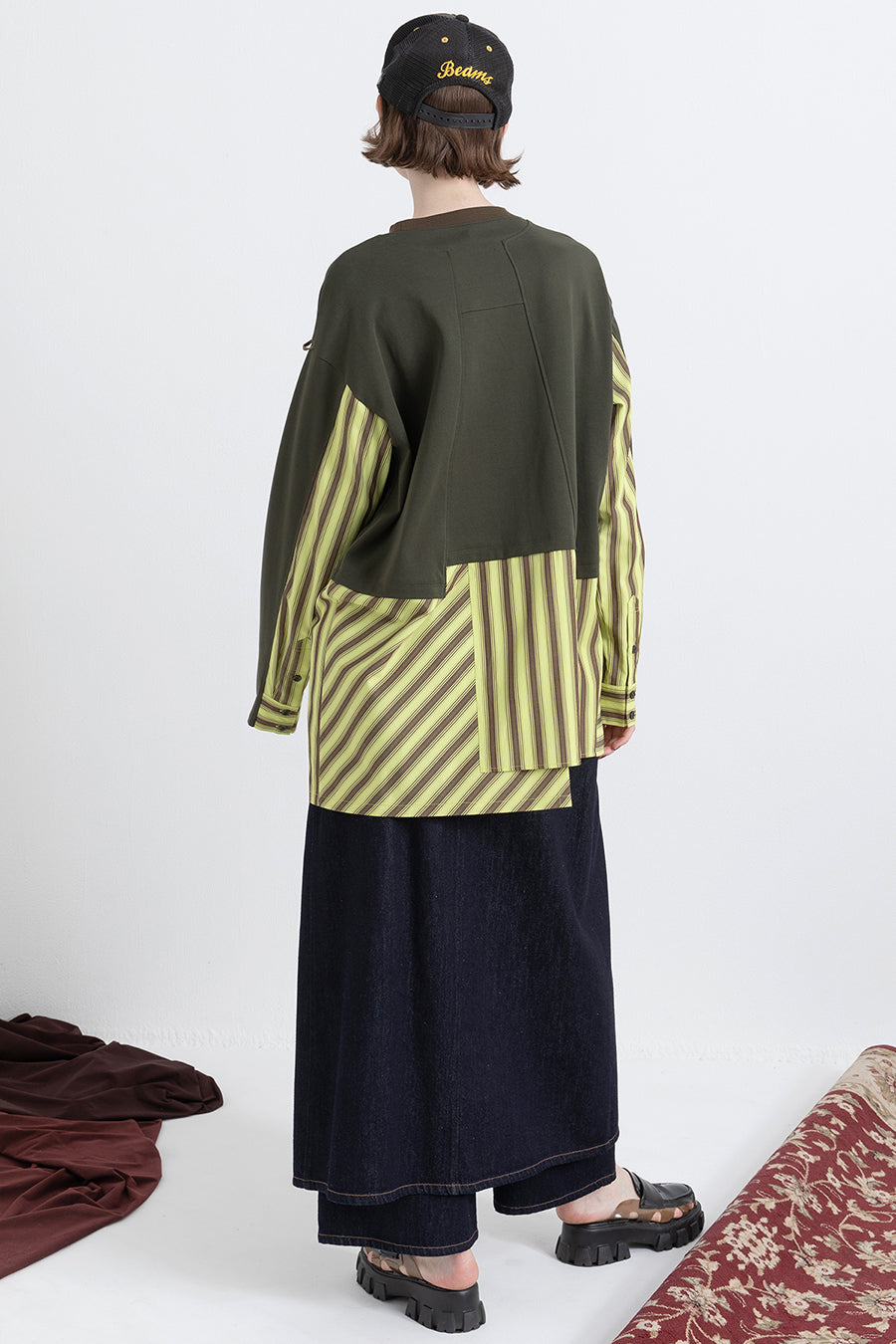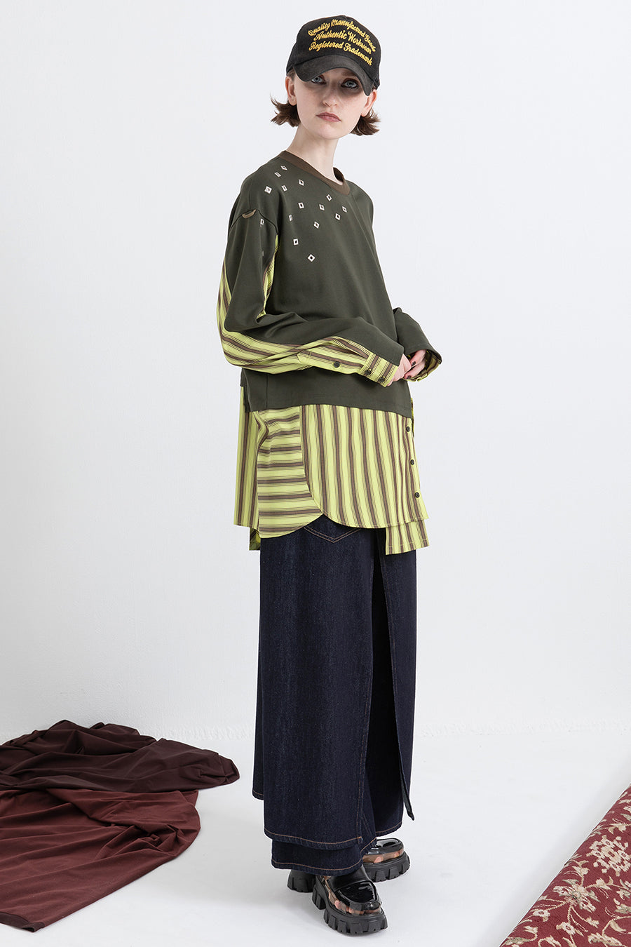 サラリとしたコットンスムースをべスースに、ストライプのシャツ生地を組み合わせたロングスリーブTシャツ。秋を感じられる温かみのあるストライプが目を引き、袖はロールアップタブが付いているので、多様な気温に対応できるのも嬉しいポイント。右肩周辺には、スクエア型のハトメをランダムにつけてアクセントに。ゆとりのあるサイジングでストレスフリーで着られ、抜け感のある印象にしあがるアイテム。裾のシャツボタンを開けると、よりAラインのシルエットも楽しめる。