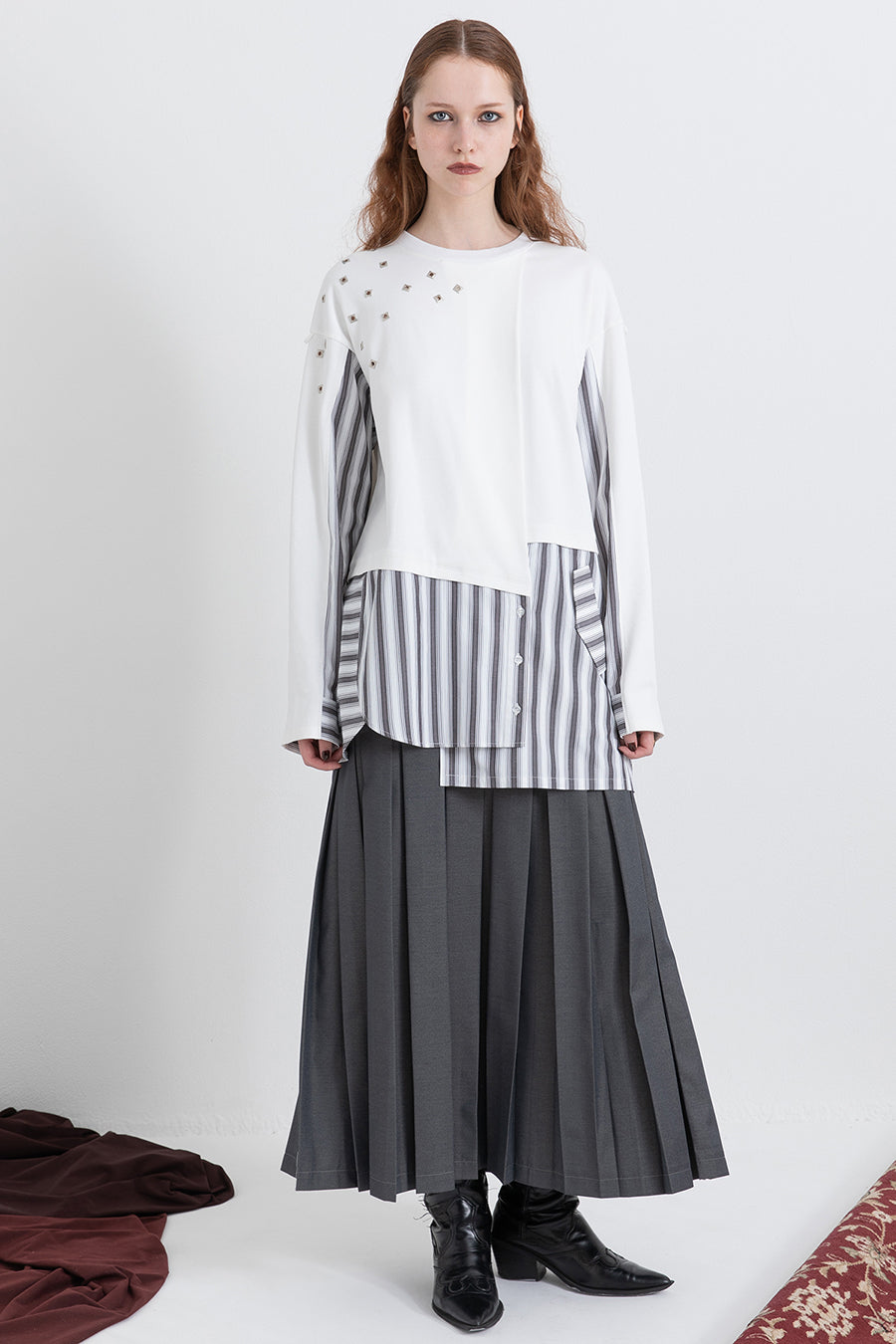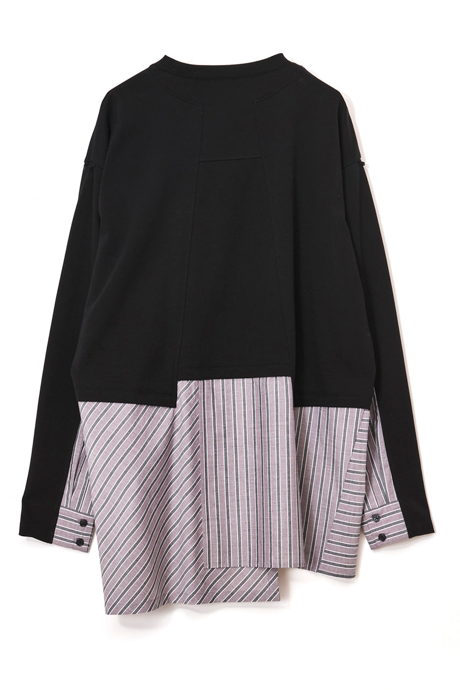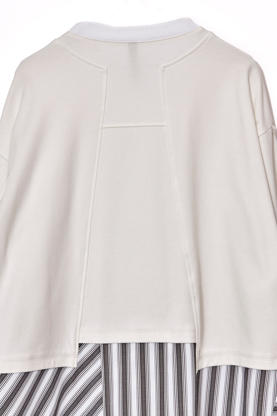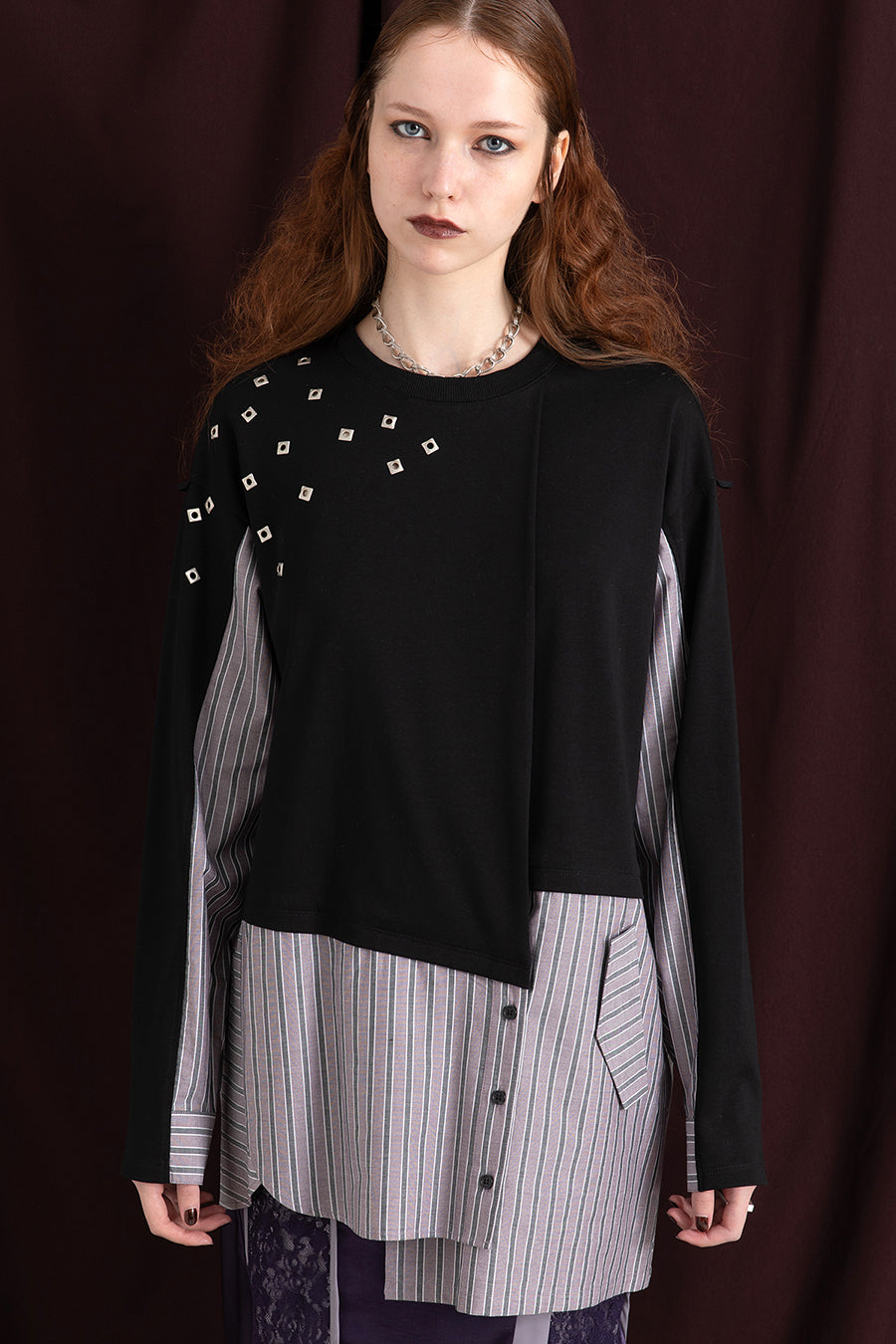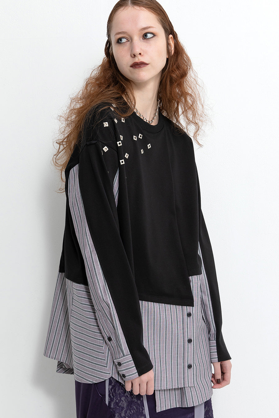 サラリとしたコットンスムースをべスースに、ストライプのシャツ生地を組み合わせたロングスリーブTシャツ。秋を感じられる温かみのあるストライプが目を引き、袖はロールアップタブが付いているので、多様な気温に対応できるのも嬉しいポイント。右肩周辺には、スクエア型のハトメをランダムにつけてアクセントに。ゆとりのあるサイジングでストレスフリーで着られ、抜け感のある印象にしあがるアイテム。裾のシャツボタンを開けると、よりAラインのシルエットも楽しめる。
