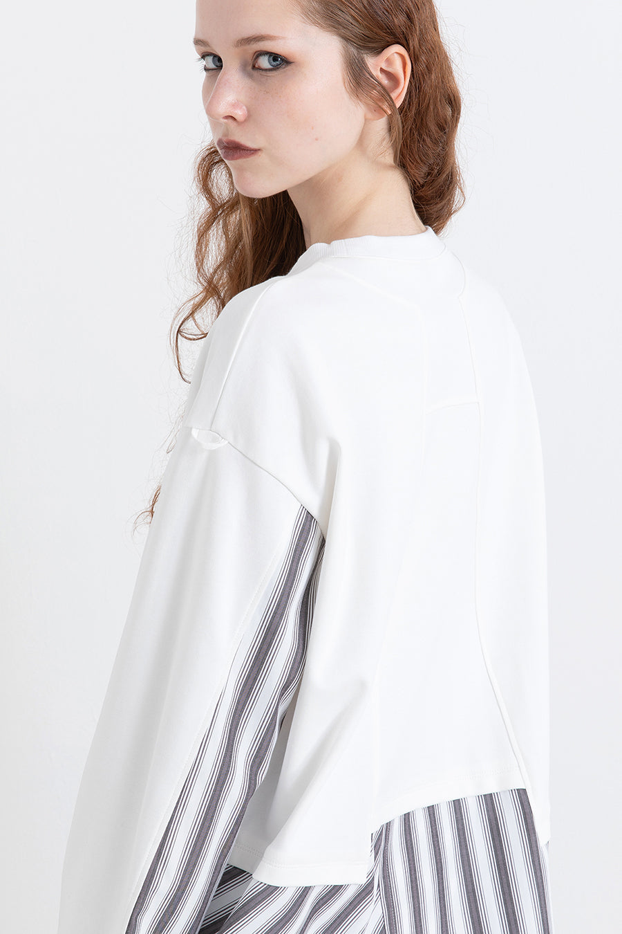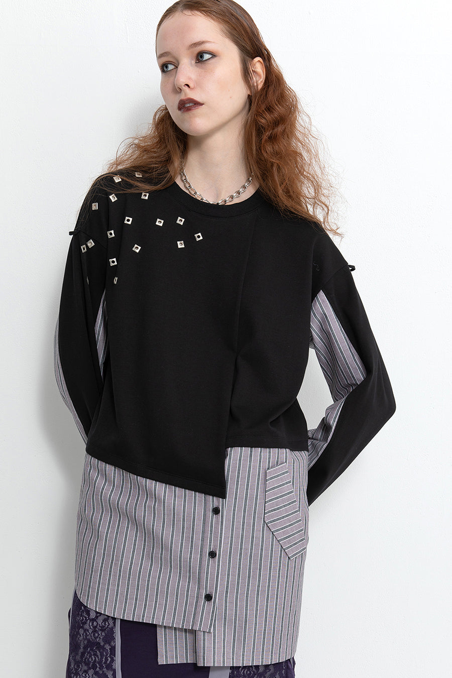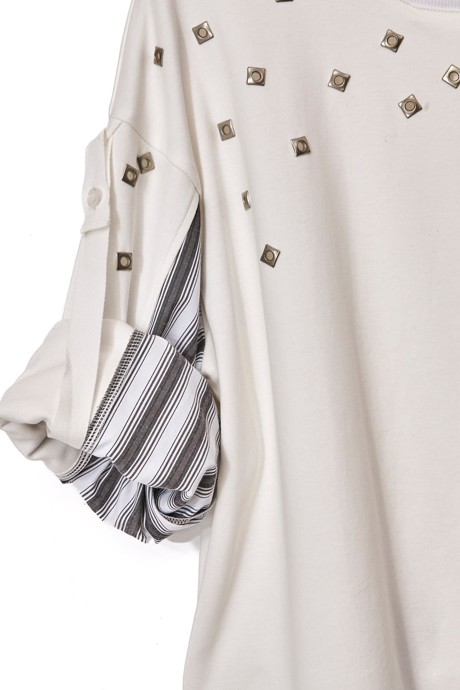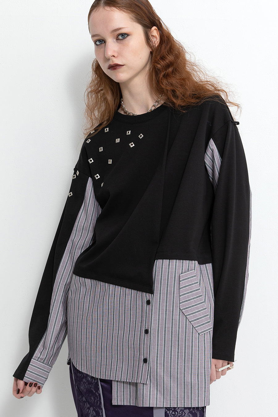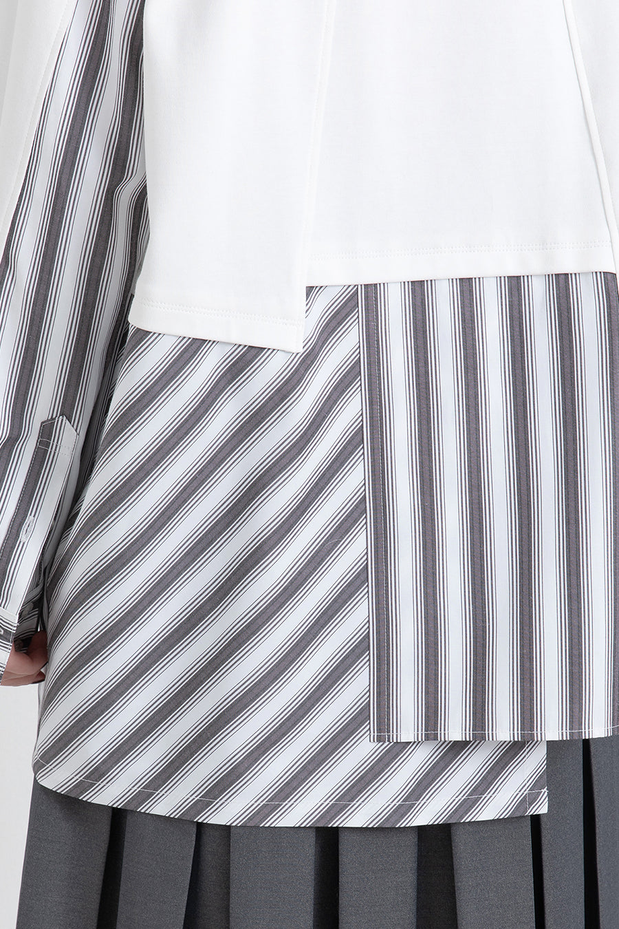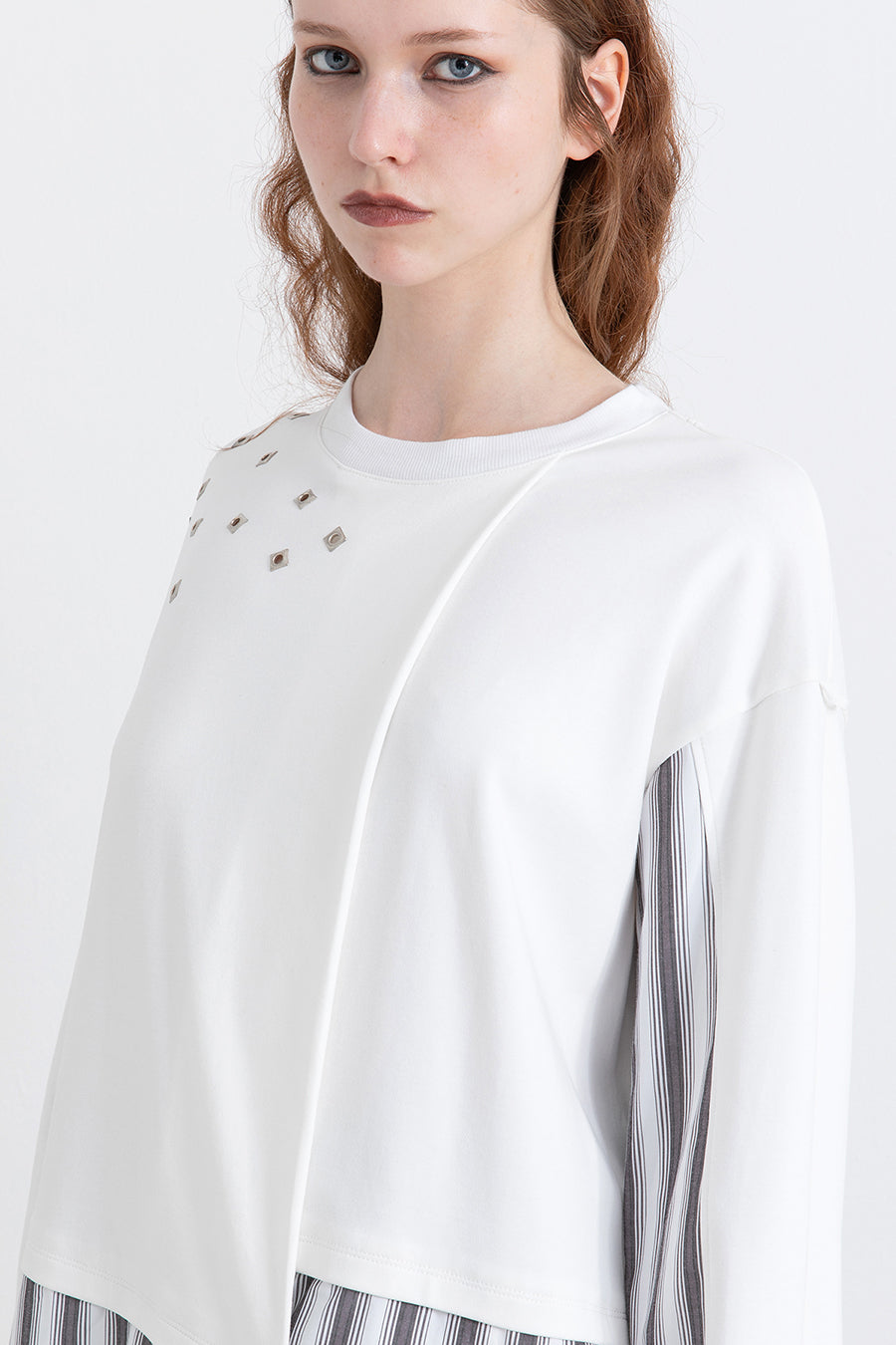 サラリとしたコットンスムースをべスースに、ストライプのシャツ生地を組み合わせたロングスリーブTシャツ。秋を感じられる温かみのあるストライプが目を引き、袖はロールアップタブが付いているので、多様な気温に対応できるのも嬉しいポイント。右肩周辺には、スクエア型のハトメをランダムにつけてアクセントに。ゆとりのあるサイジングでストレスフリーで着られ、抜け感のある印象にしあがるアイテム。裾のシャツボタンを開けると、よりAラインのシルエットも楽しめる。