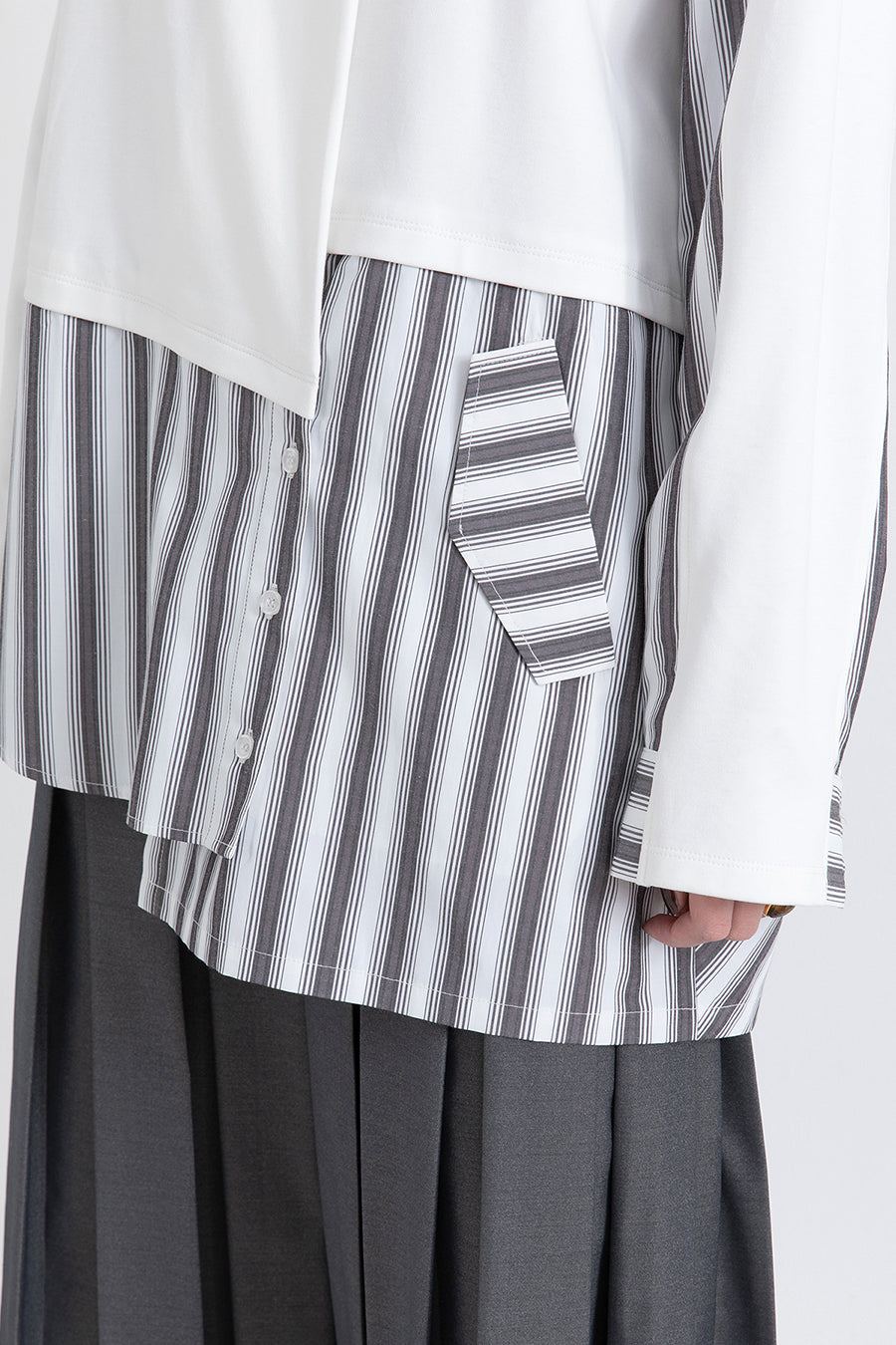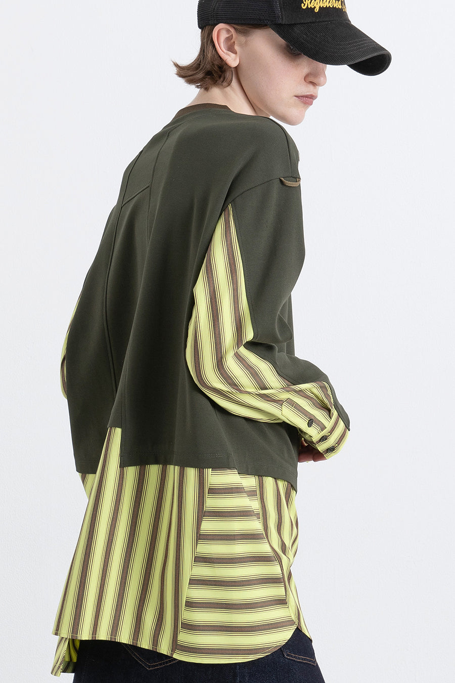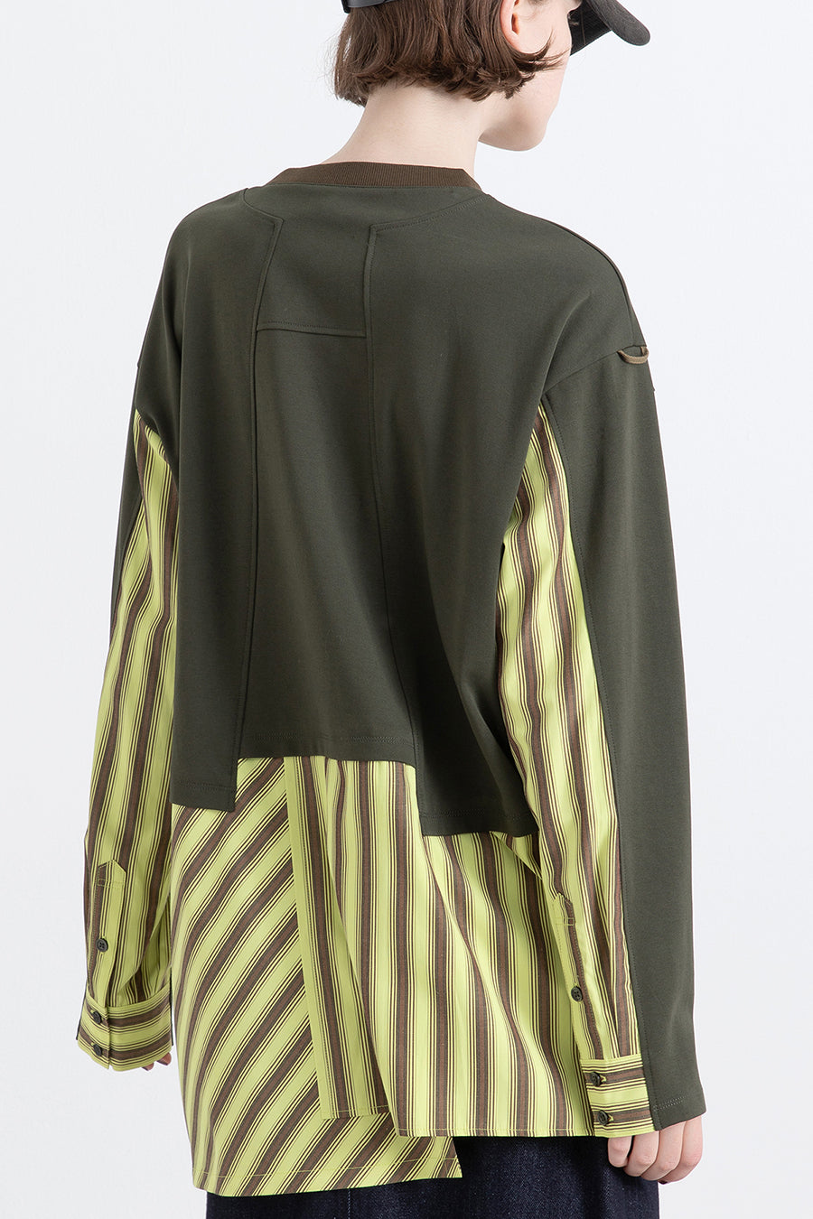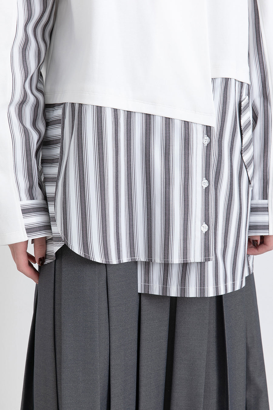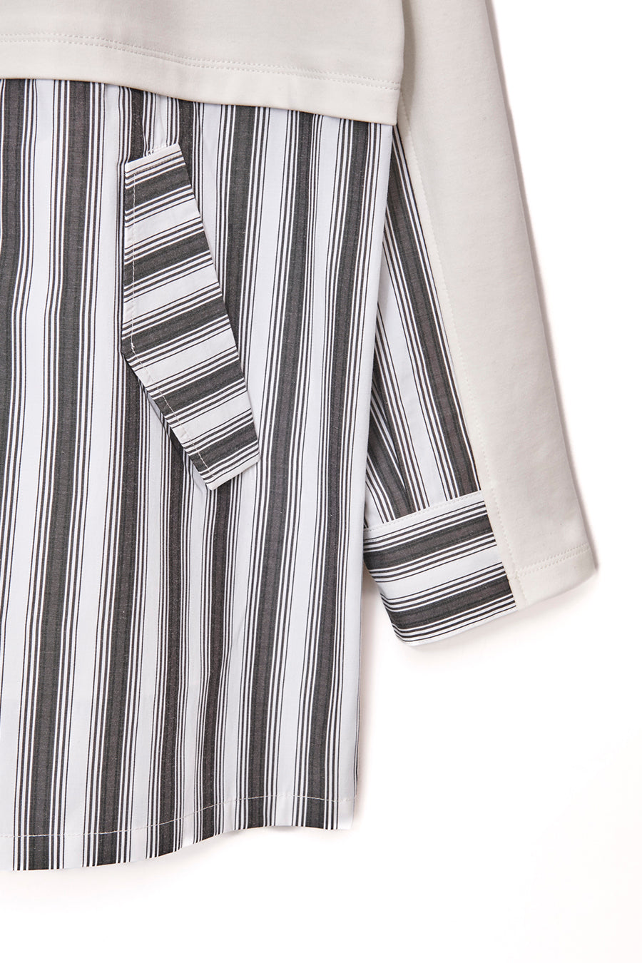 サラリとしたコットンスムースをべスースに、ストライプのシャツ生地を組み合わせたロングスリーブTシャツ。秋を感じられる温かみのあるストライプが目を引き、袖はロールアップタブが付いているので、多様な気温に対応できるのも嬉しいポイント。右肩周辺には、スクエア型のハトメをランダムにつけてアクセントに。ゆとりのあるサイジングでストレスフリーで着られ、抜け感のある印象にしあがるアイテム。裾のシャツボタンを開けると、よりAラインのシルエットも楽しめる。