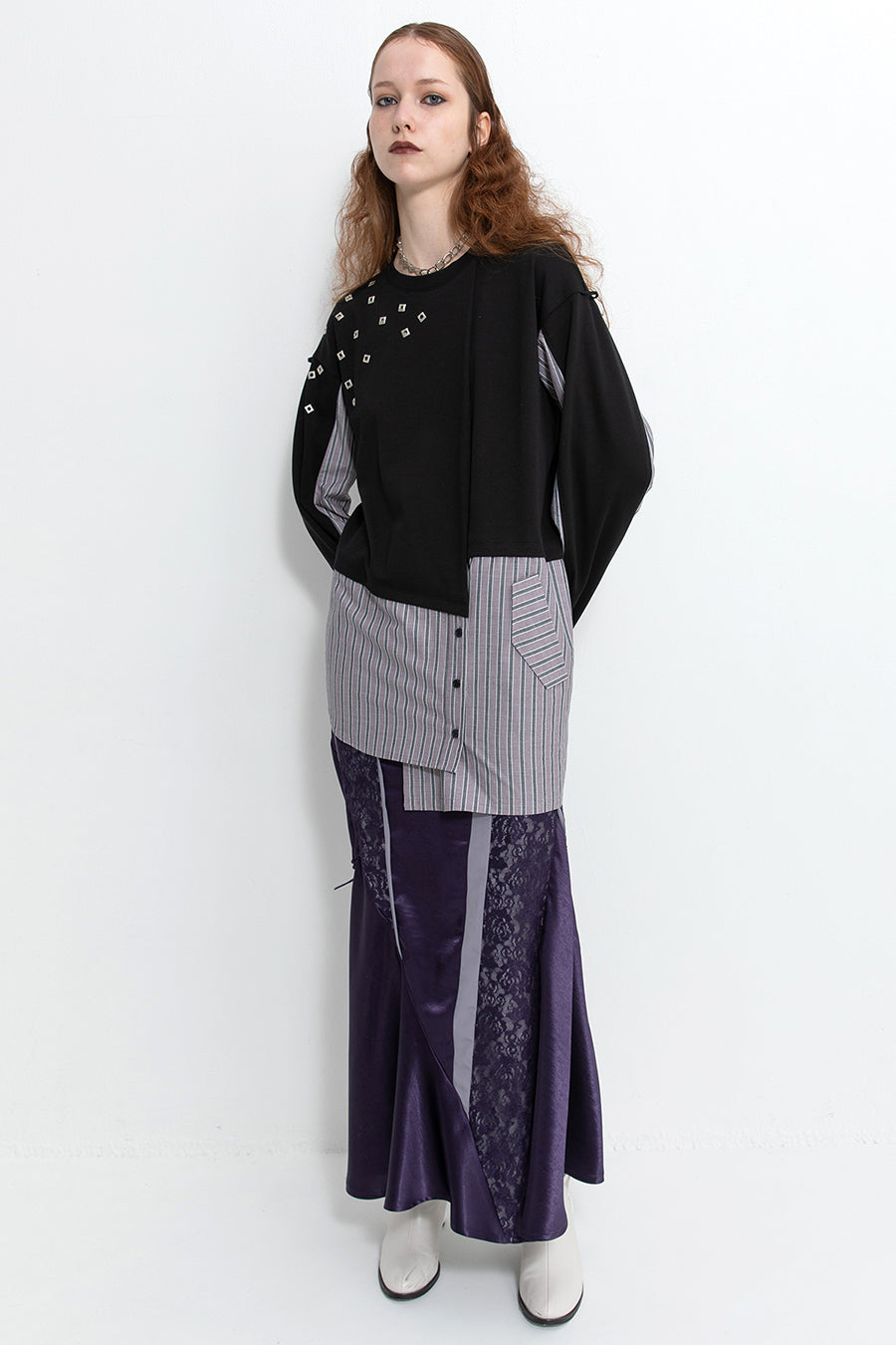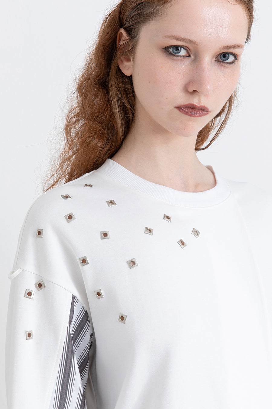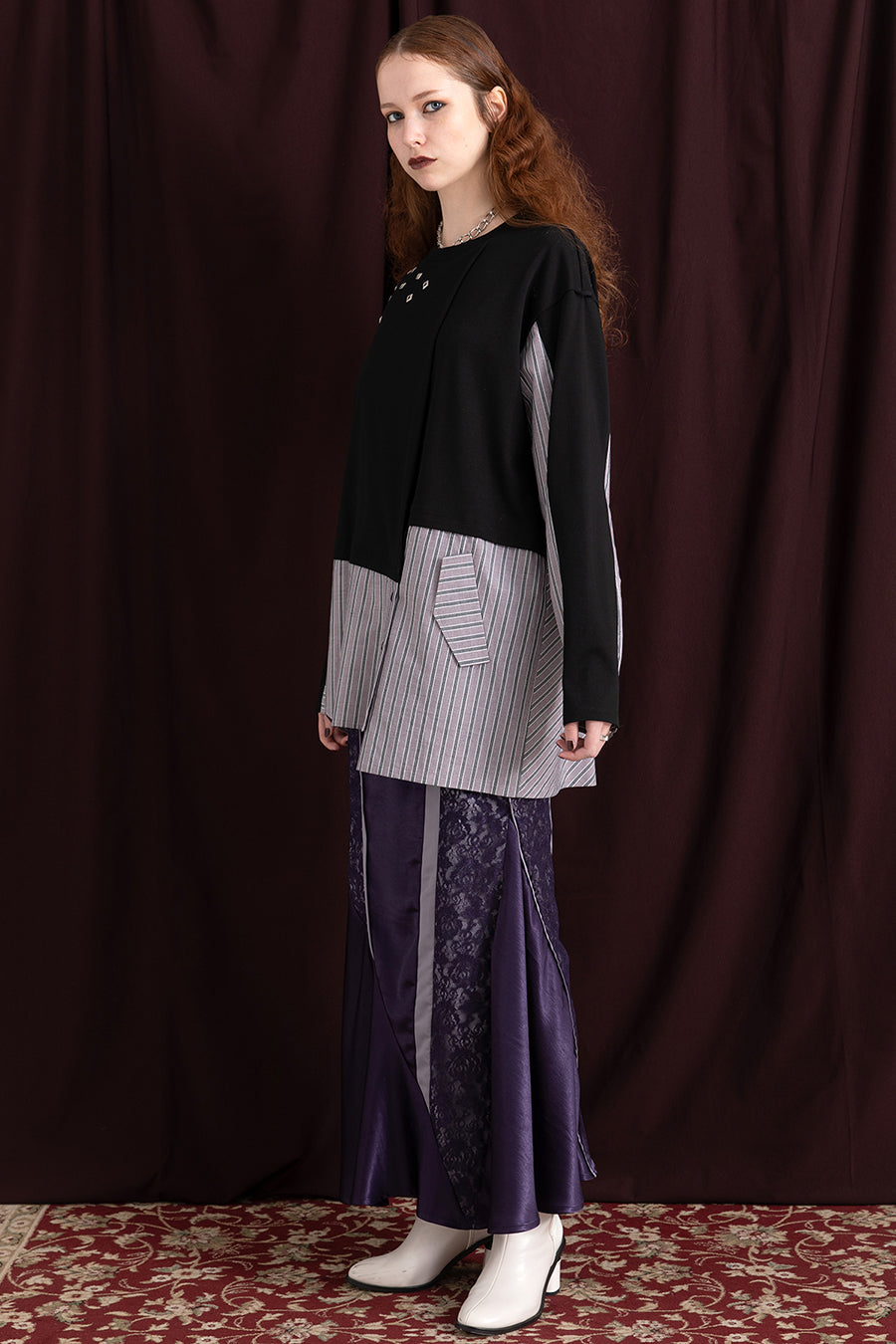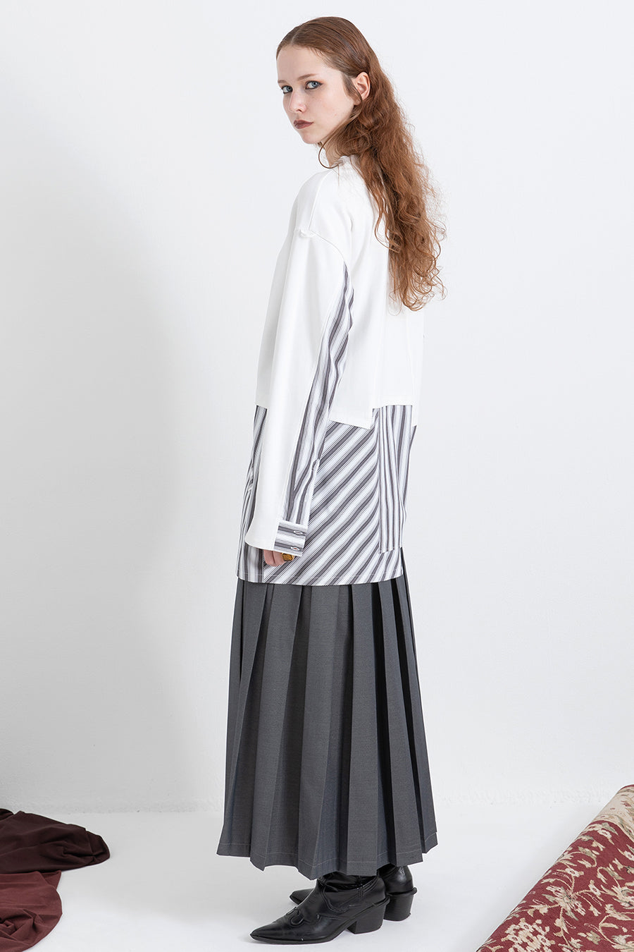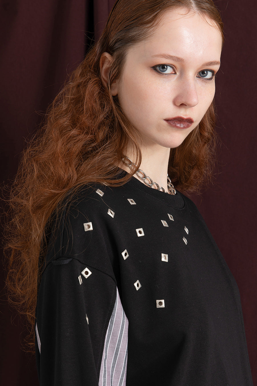 サラリとしたコットンスムースをべスースに、ストライプのシャツ生地を組み合わせたロングスリーブTシャツ。秋を感じられる温かみのあるストライプが目を引き、袖はロールアップタブが付いているので、多様な気温に対応できるのも嬉しいポイント。右肩周辺には、スクエア型のハトメをランダムにつけてアクセントに。ゆとりのあるサイジングでストレスフリーで着られ、抜け感のある印象にしあがるアイテム。裾のシャツボタンを開けると、よりAラインのシルエットも楽しめる。