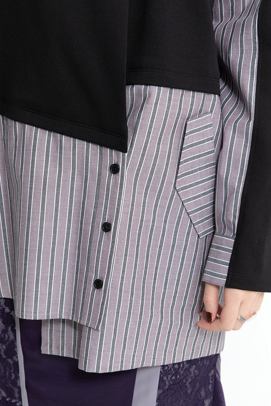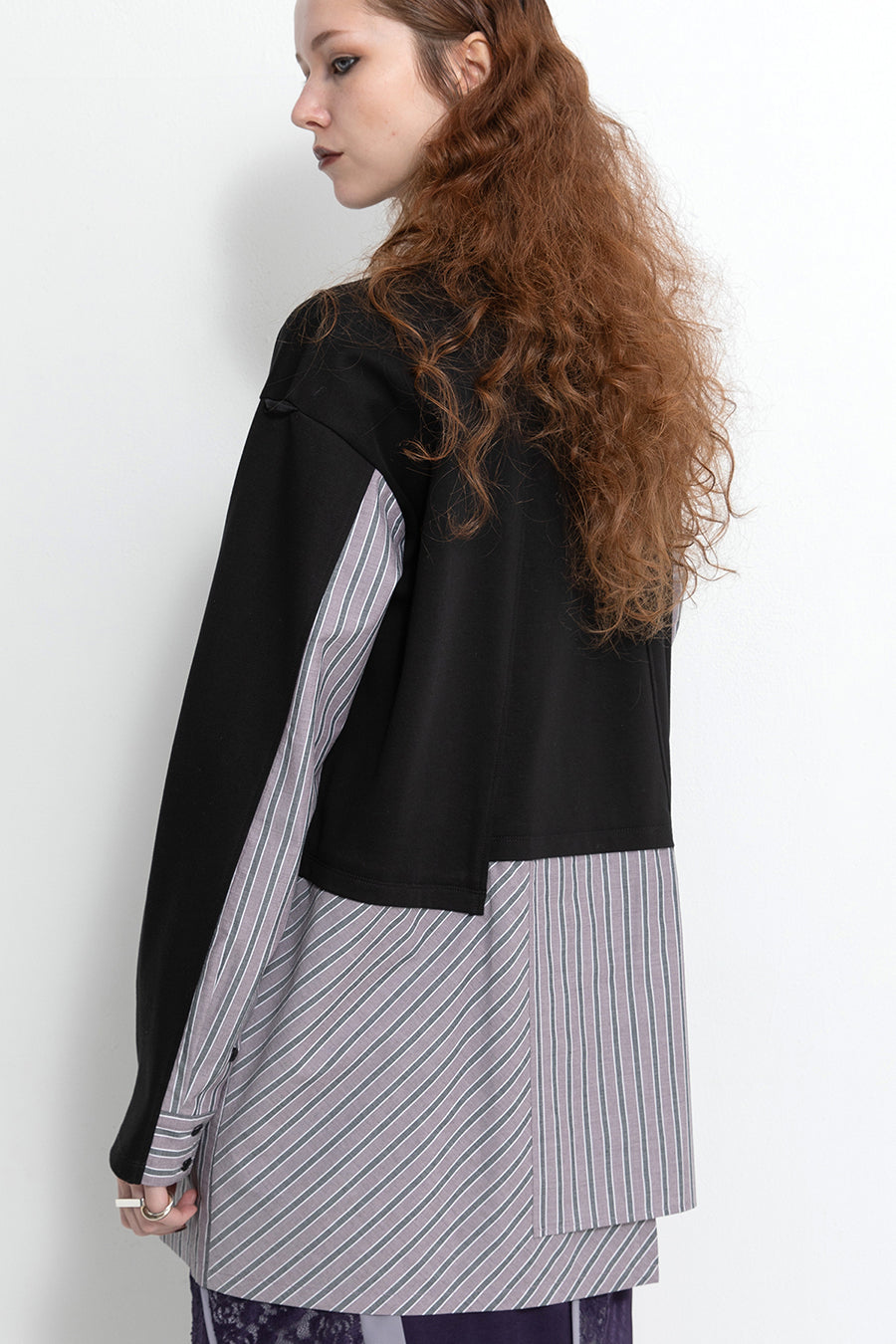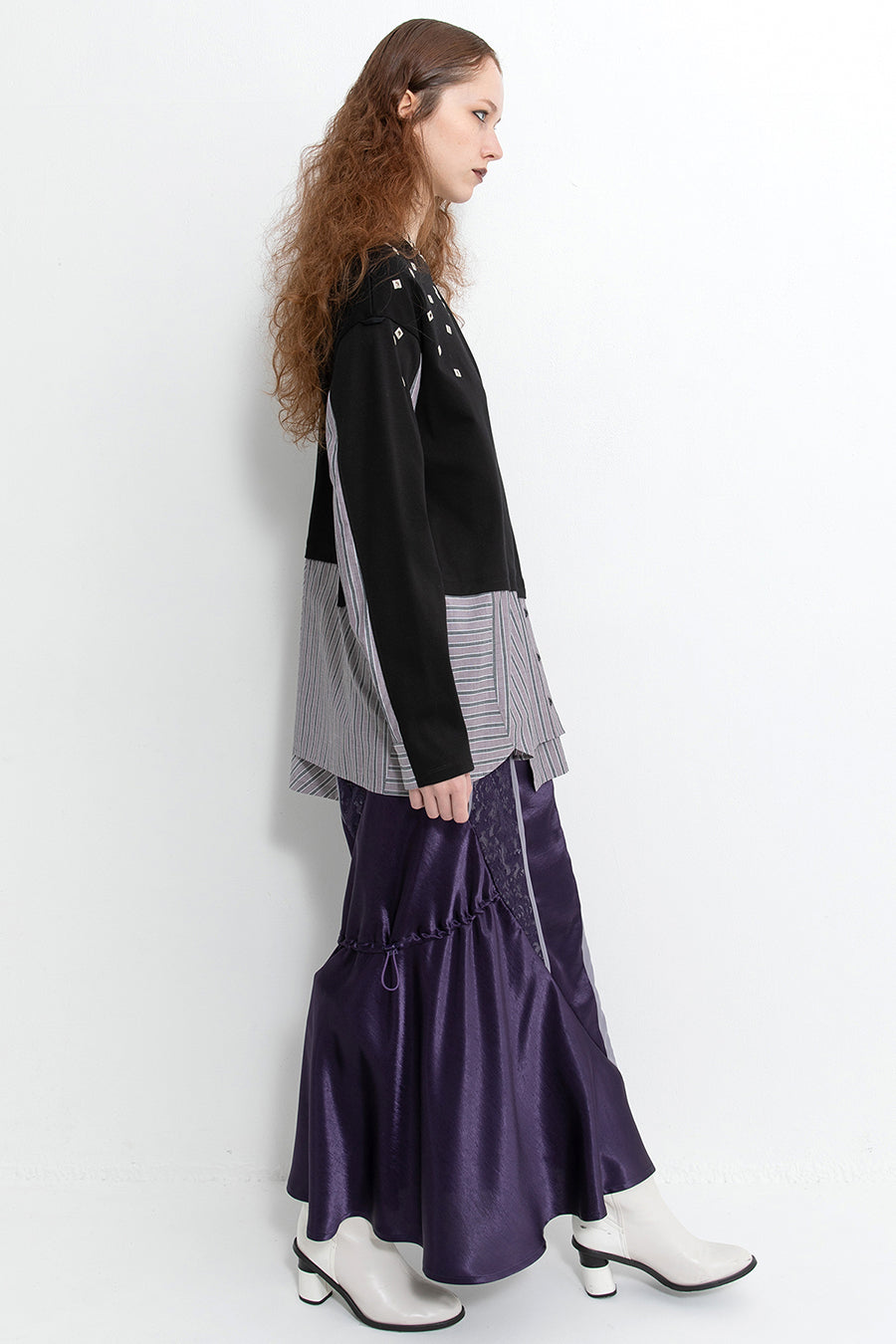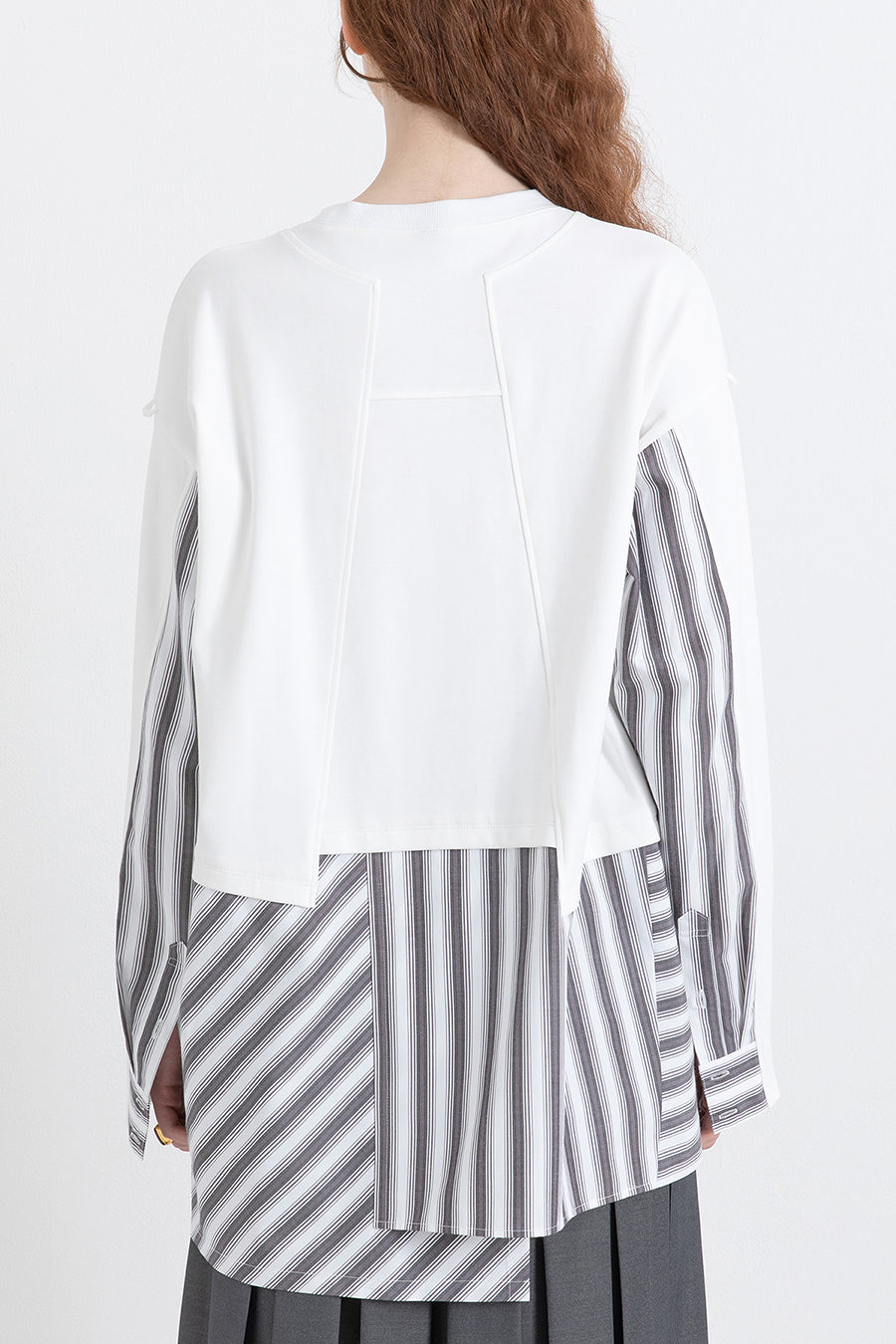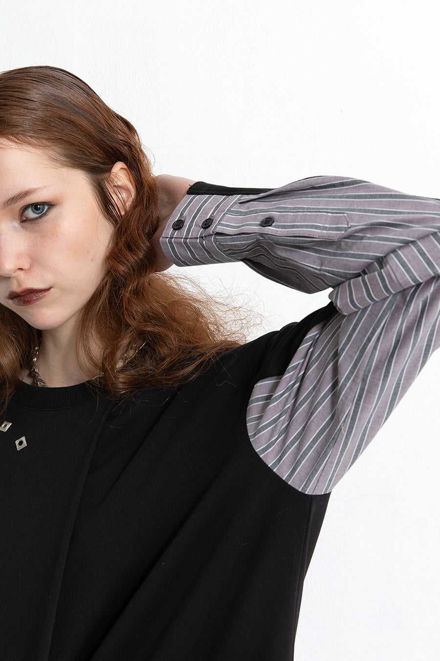 サラリとしたコットンスムースをべスースに、ストライプのシャツ生地を組み合わせたロングスリーブTシャツ。秋を感じられる温かみのあるストライプが目を引き、袖はロールアップタブが付いているので、多様な気温に対応できるのも嬉しいポイント。右肩周辺には、スクエア型のハトメをランダムにつけてアクセントに。ゆとりのあるサイジングでストレスフリーで着られ、抜け感のある印象にしあがるアイテム。裾のシャツボタンを開けると、よりAラインのシルエットも楽しめる。